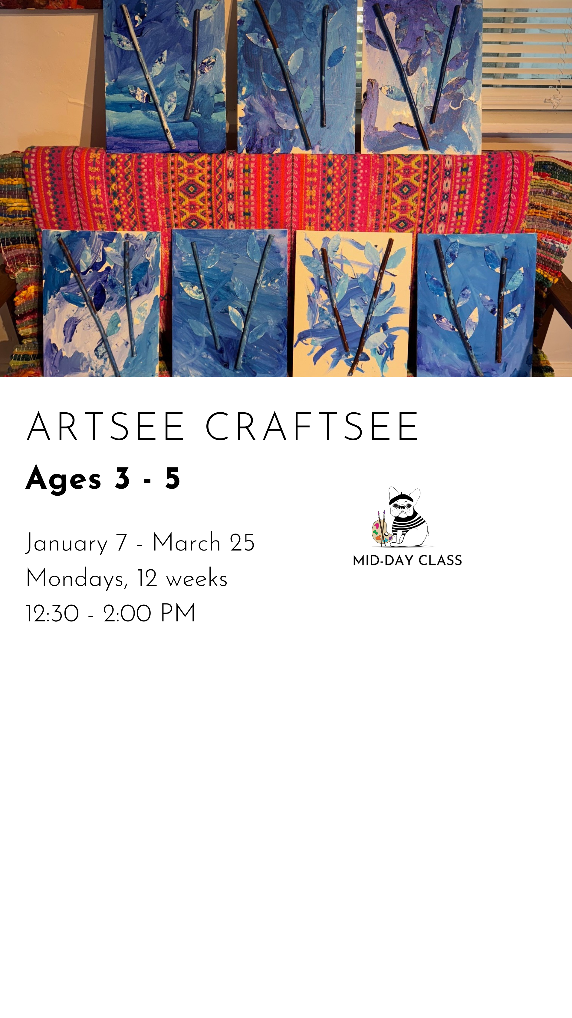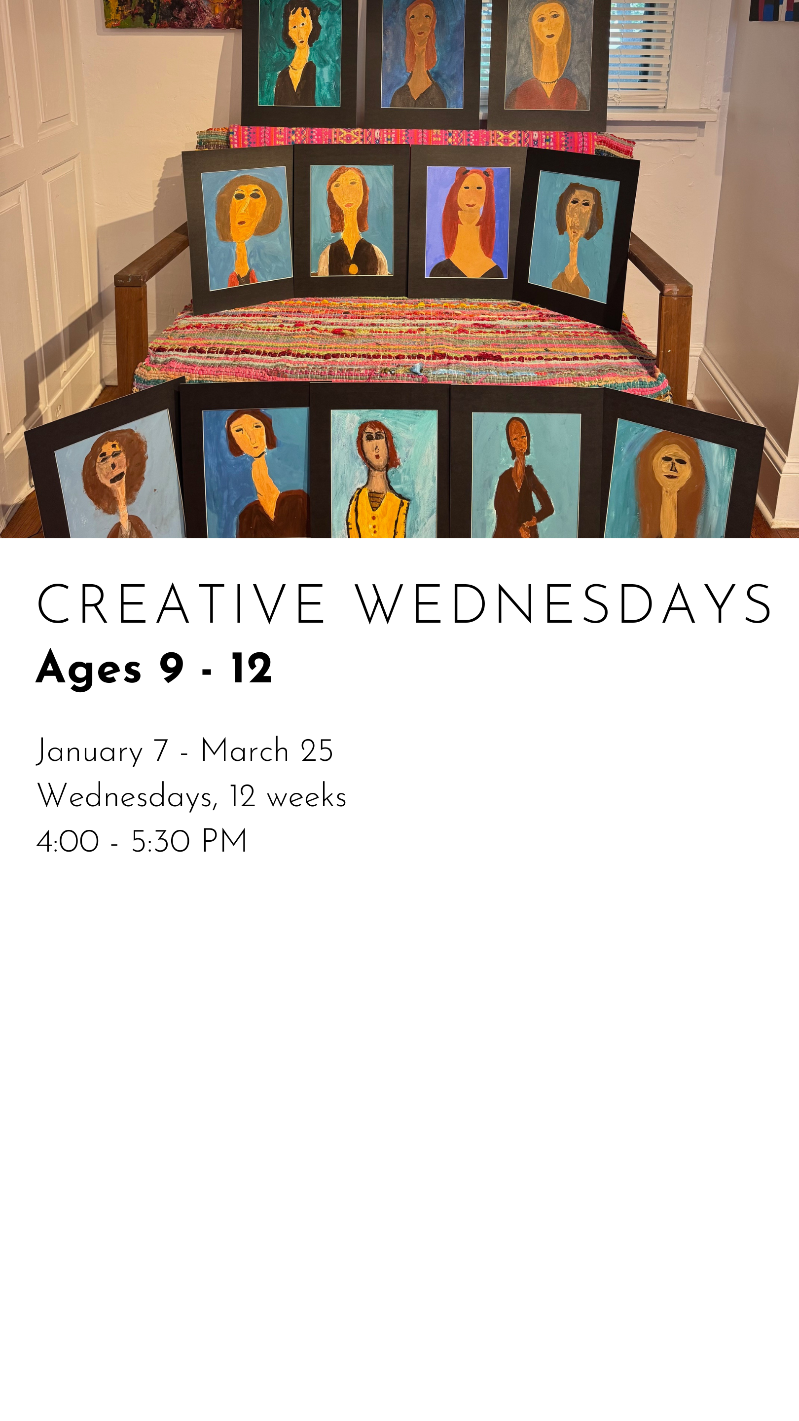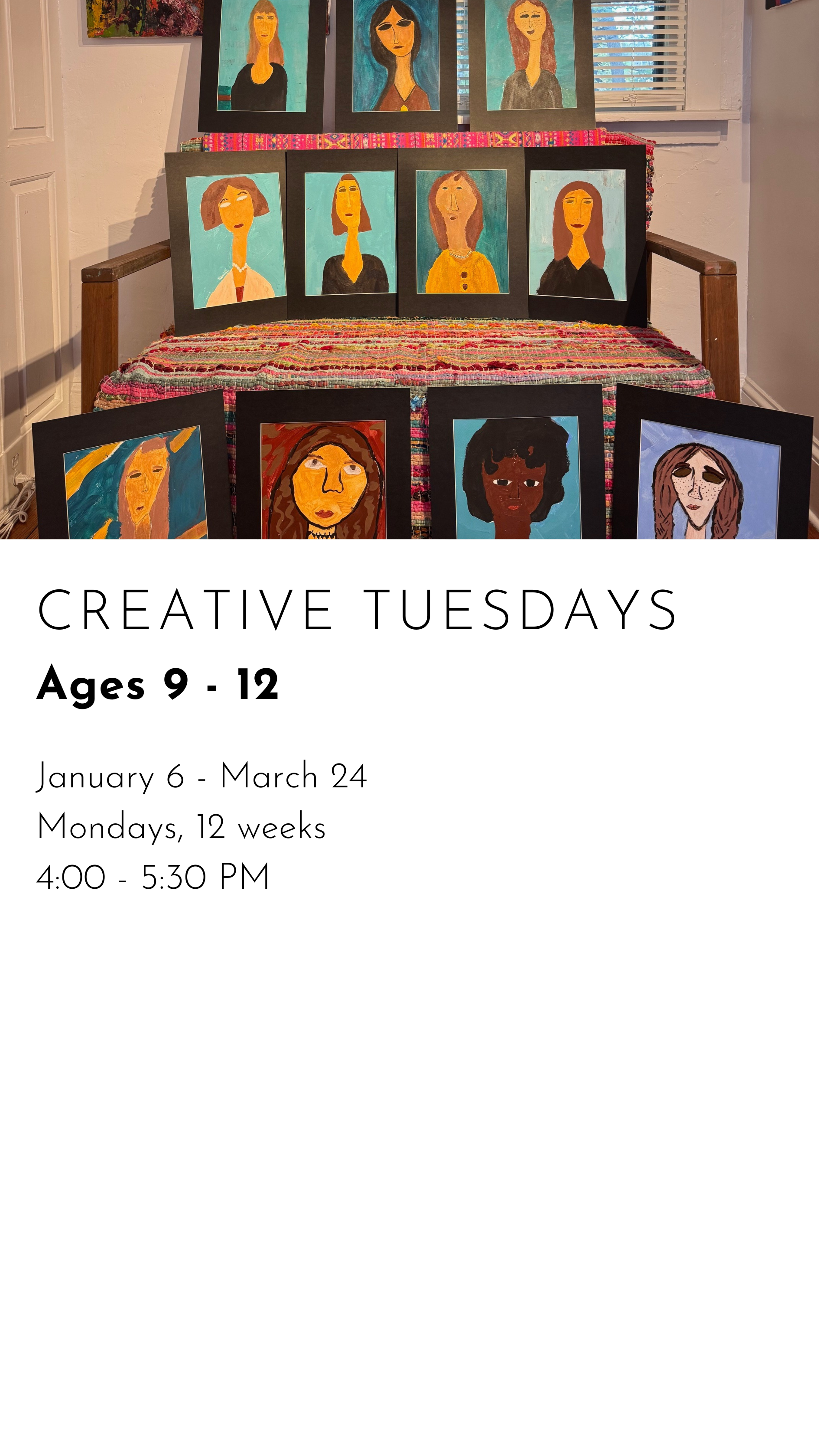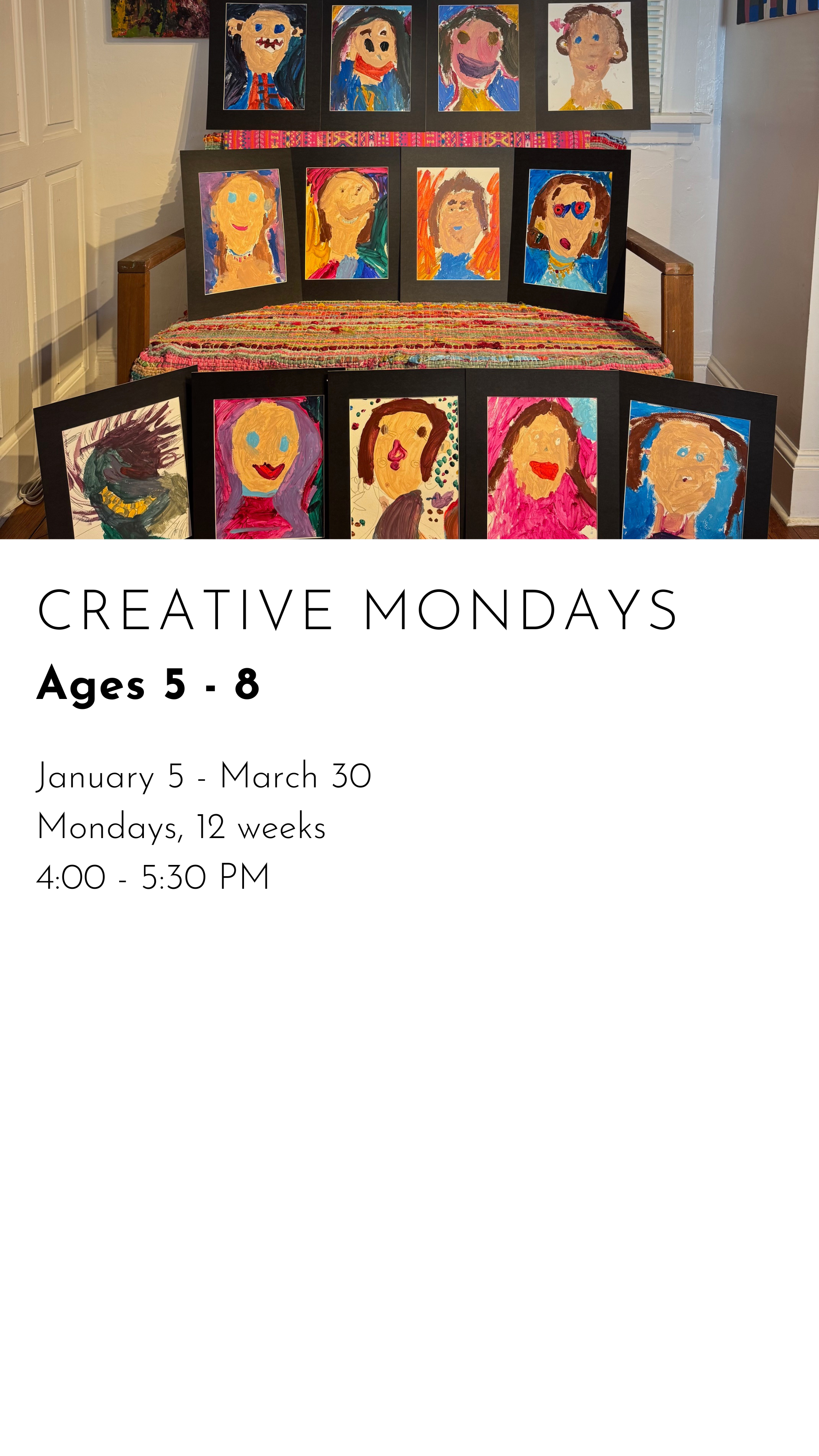 REGISTER FOR WINTER CLASSES CREATIVE MONDAYS $480.00 REGISTER FOR CREATIVE MONDAYS Added! CREATIVE TUESDAYS $480.00 REGISTER FOR CREATIVE TUESDAYS Added! ARTSEE CRAFTSEE $480.00 REGISTER FOR ARTSEE CRAFTSEE Added! CREATIVE WEDNESDAYS $480.00 REGISTER FOR CREATIVE WEDNESDAYS Added! CREATIVE THURSDAYS $480.00 REGISTER FOR CREATIVE THURSDAYS Added! ART LITTLES $480.00 REGISTER FOR ART LITTLES Added! ART LEAGUE $480.00 REGISTER FOR ART LEAGUE Added!
